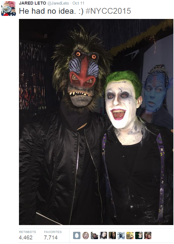 Leto, who donned a baboon mask, even posed for a photo with a fan cosplaying the Joker character he will be portraying in Suicide Squad: